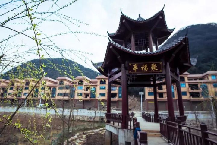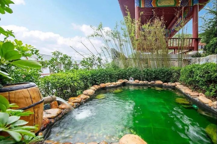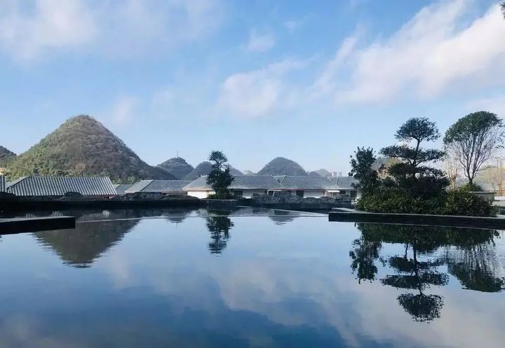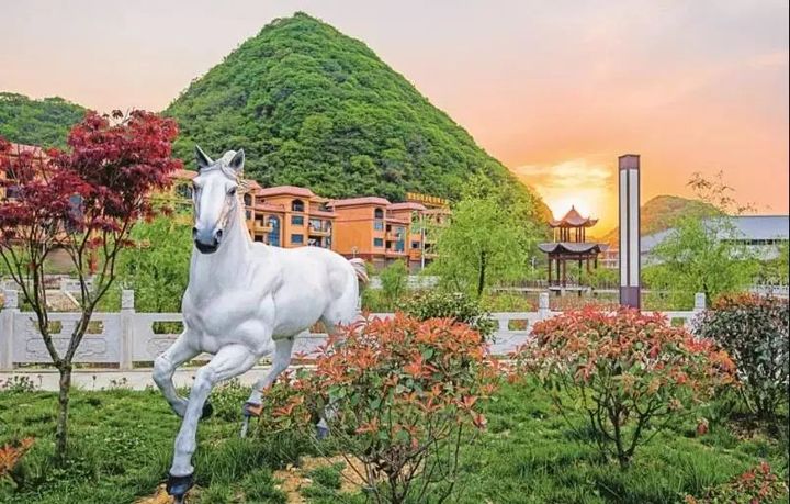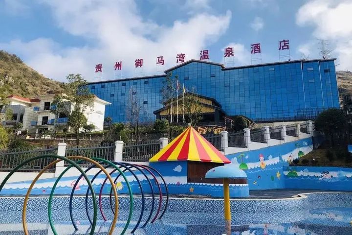 位於安順經開區馬廠村半山之畔的禦馬溫泉,酒店依山而建、俯覽群山、瞭望溫泉。 20多個溫泉池隱藏在古樹和綠草間,遊客在溫泉池內嬉戲。