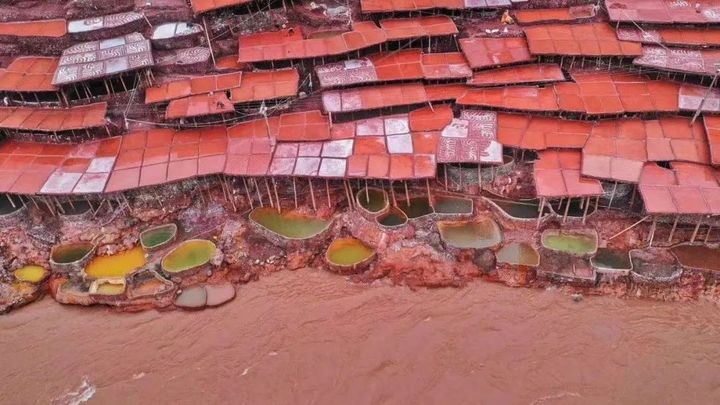 磚紅色的鹽池、碧綠的江水