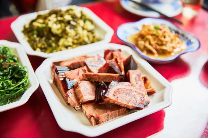除了張橋羊肉,金山的松隱羊肉也相當有名氣。 鬆隱羊肉的燒製講究一把火硬、二把火軟、三更翻身、四更添湯...... 在當地還流傳著“吃了松隱山羊肉,挨記巴掌也情願”的山歌,足以看出松隱羊肉的美味。