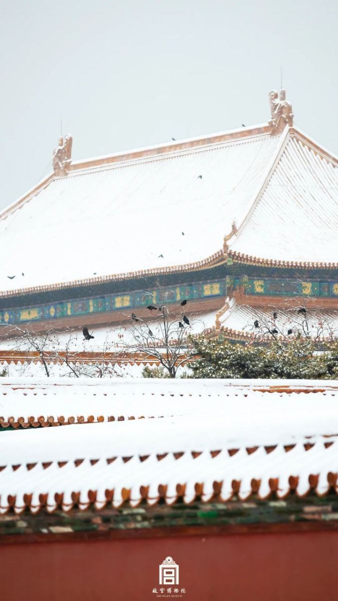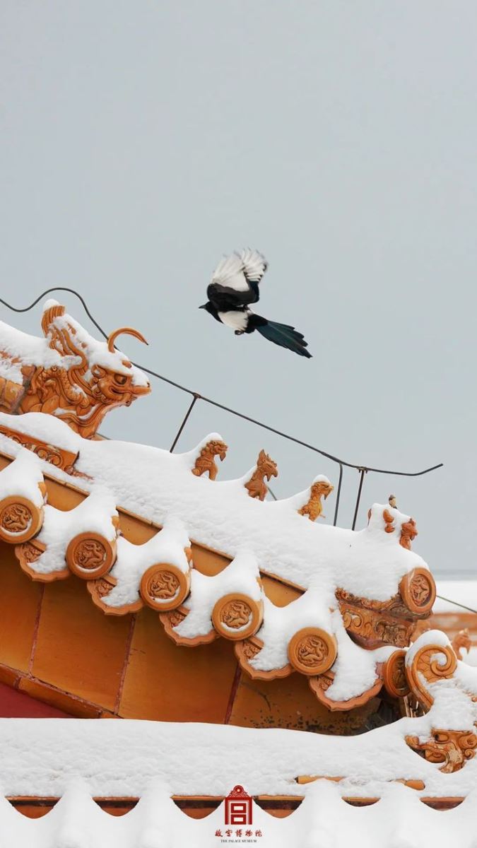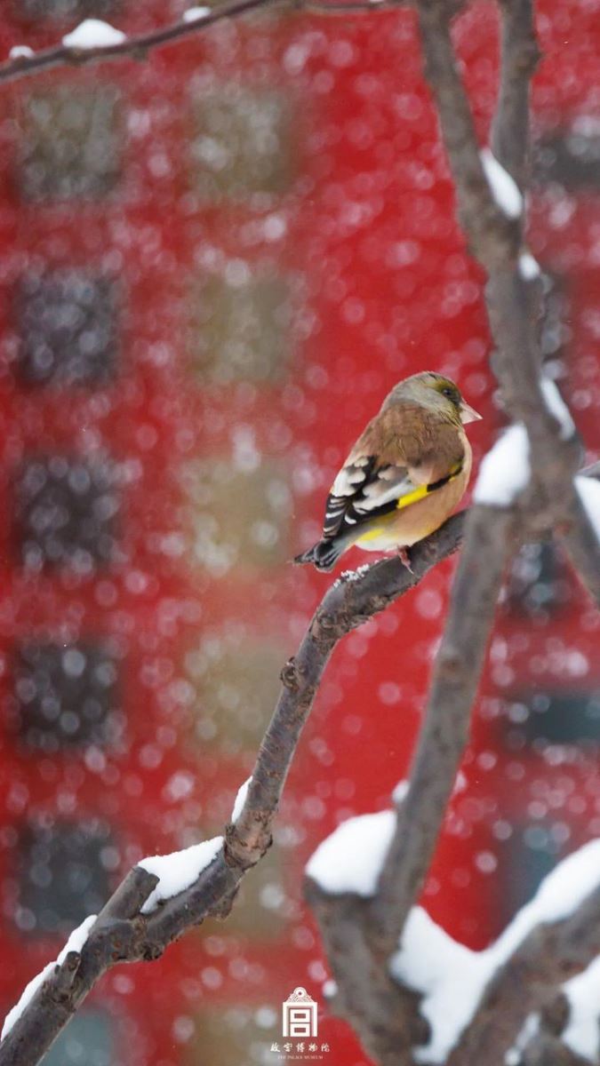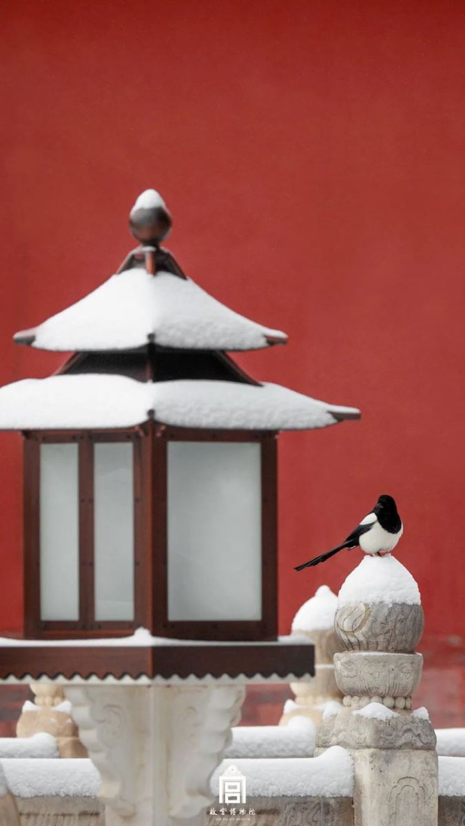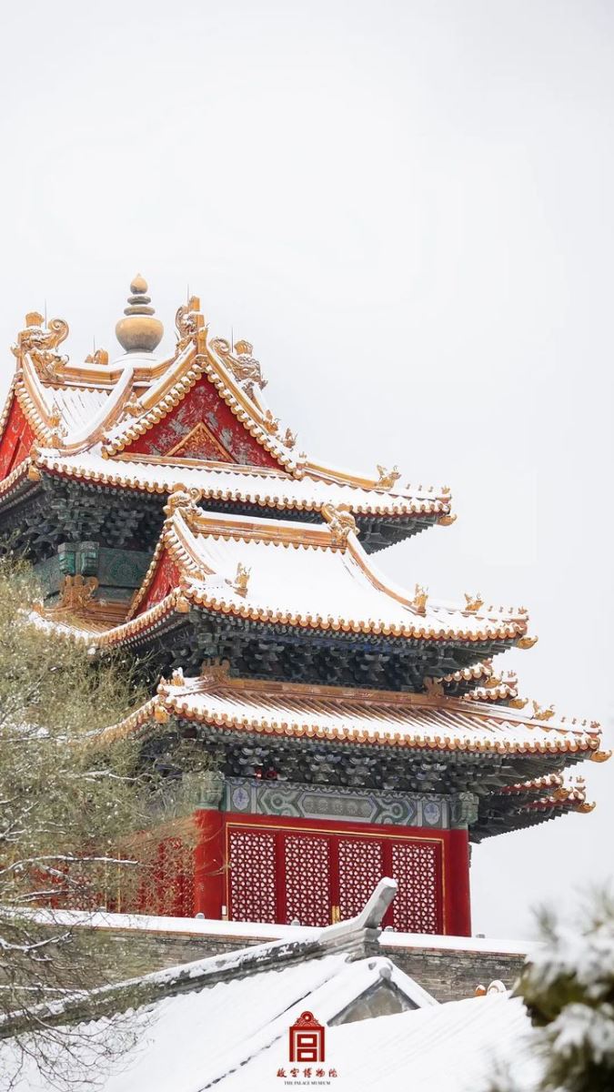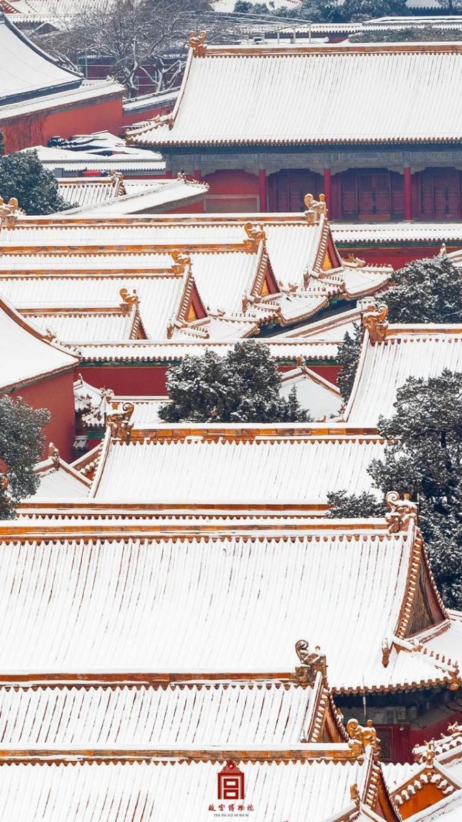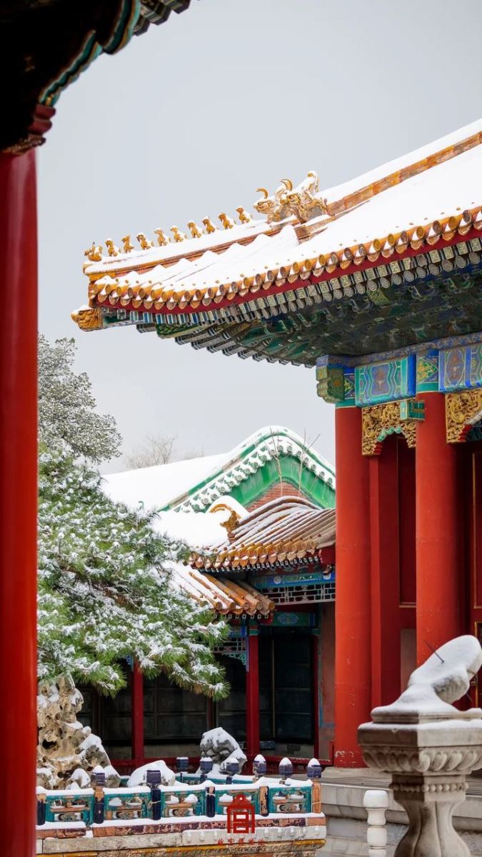簷角錯落,星點丹紅、金黃散落於素裹間,