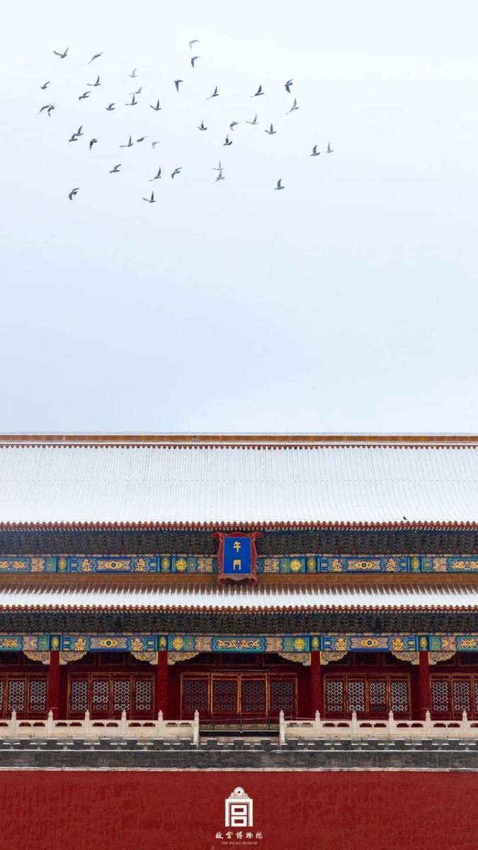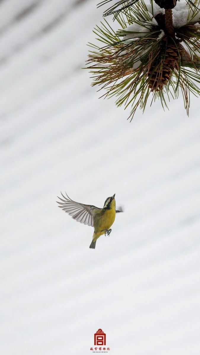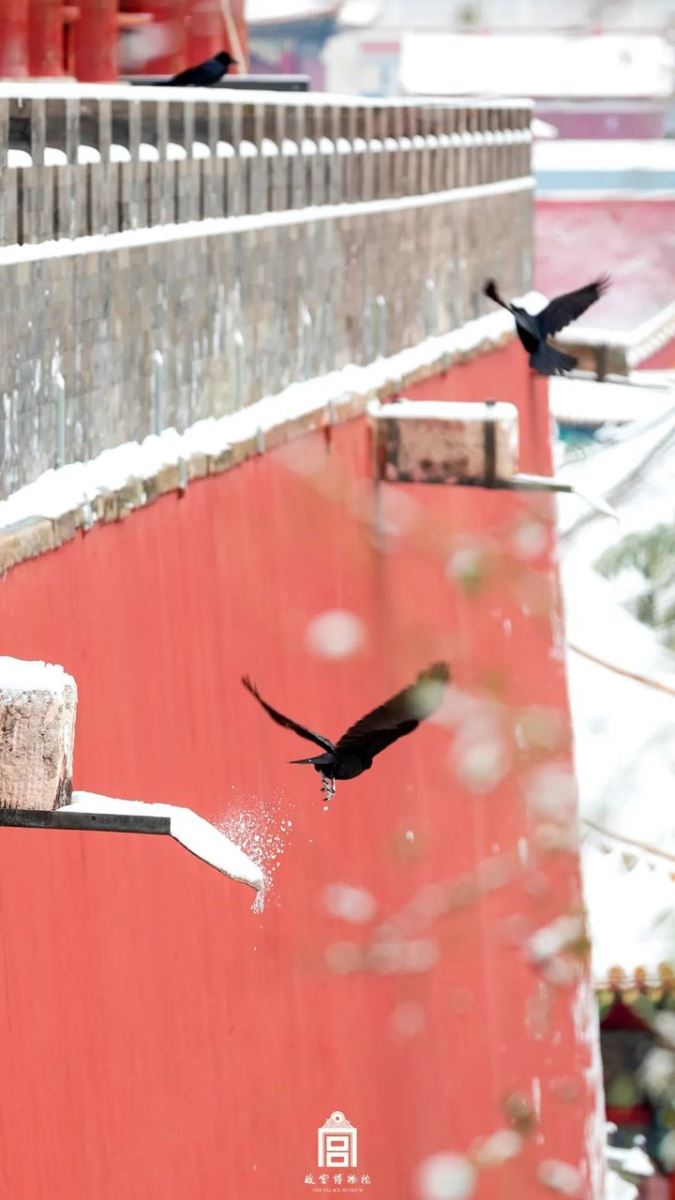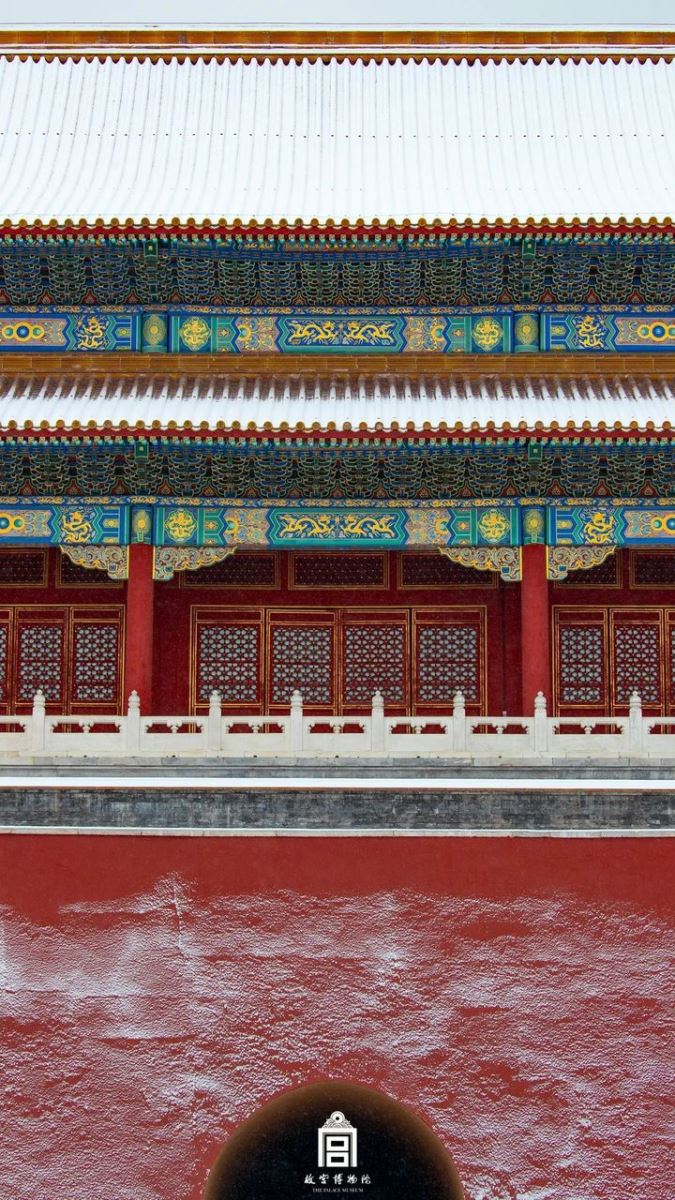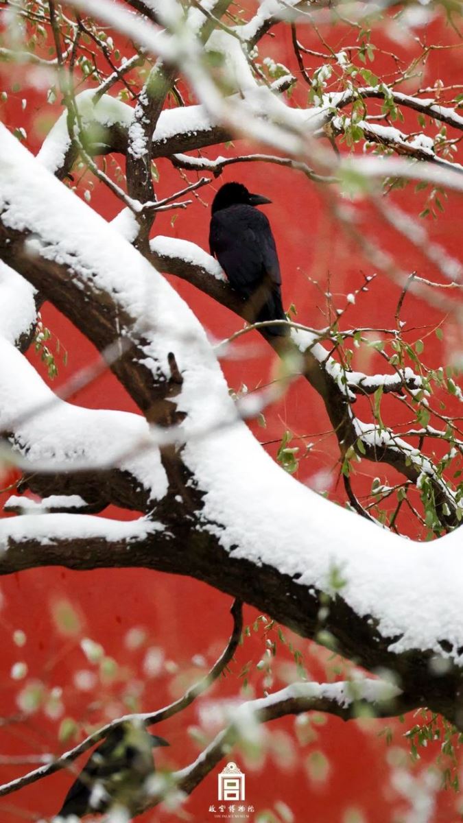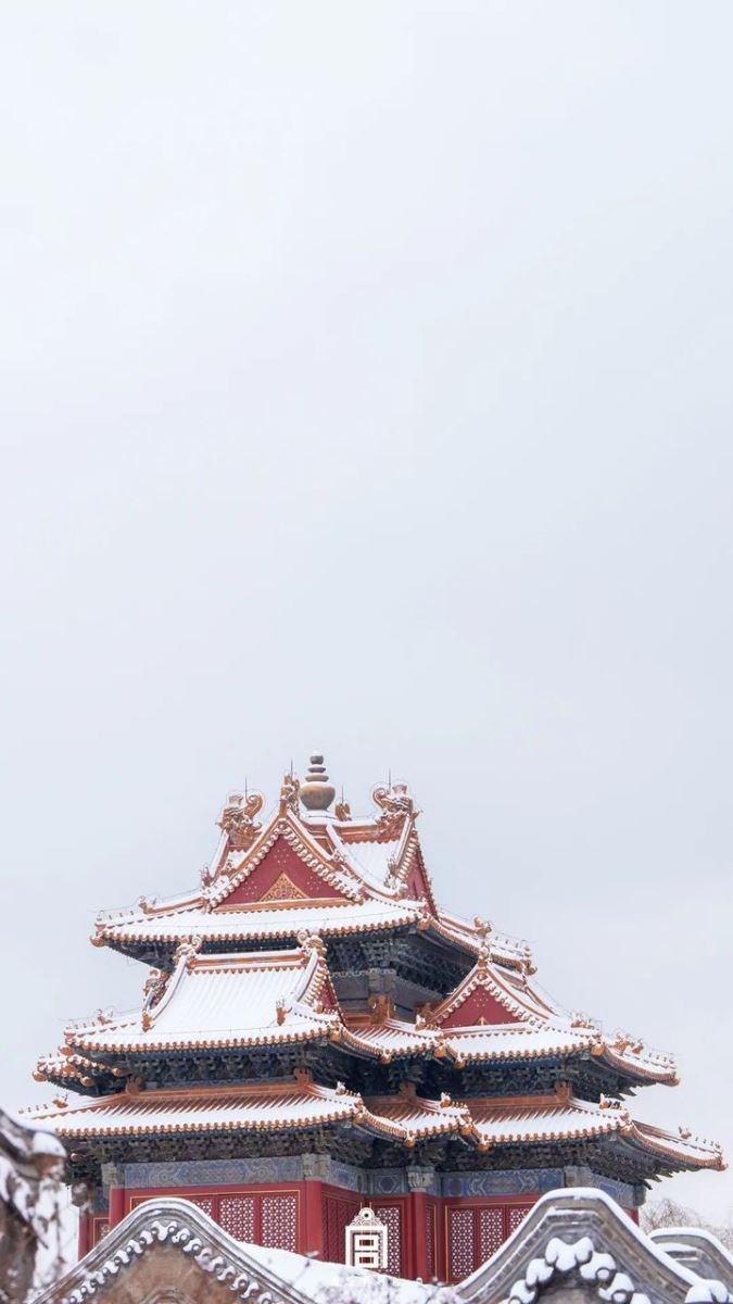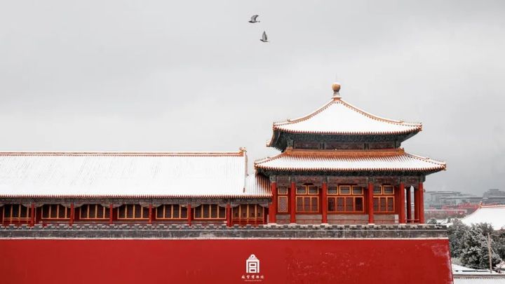 簷角錯落,星點丹紅、金黃散落於素裹間,