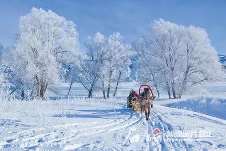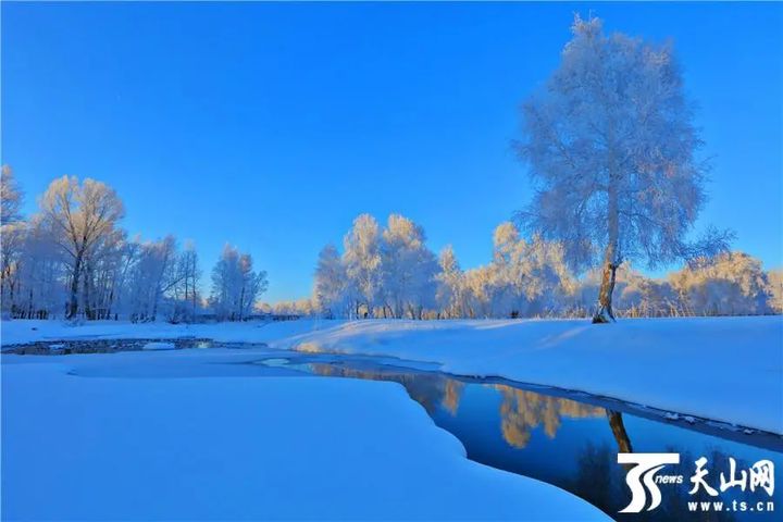 霧凇,也稱樹掛,是在嚴寒季節裡,空氣中過於飽和的水汽遇冷凝結而成,是一種自然奇觀。 新疆北部的大部分地區冬季寒冷,遇到大霧或在未完全冰封的河邊,很容易形成霧凇。 新疆的許多地方都有霧凇,而且各具特色。