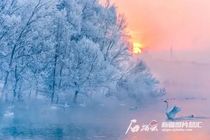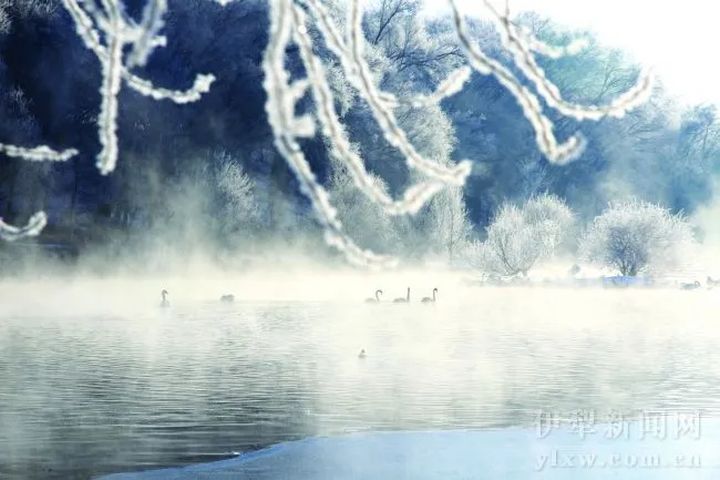 每年冬天,數百隻天鵝都會在伊寧縣天鵝泉濕地公園棲息。豐富的地下泉水讓冬季的水面霧氣繚繞,造就了岸邊奇麗的霧凇,晨霧中的天鵝若隱若現,構成一幅令人驚歎的畫面。