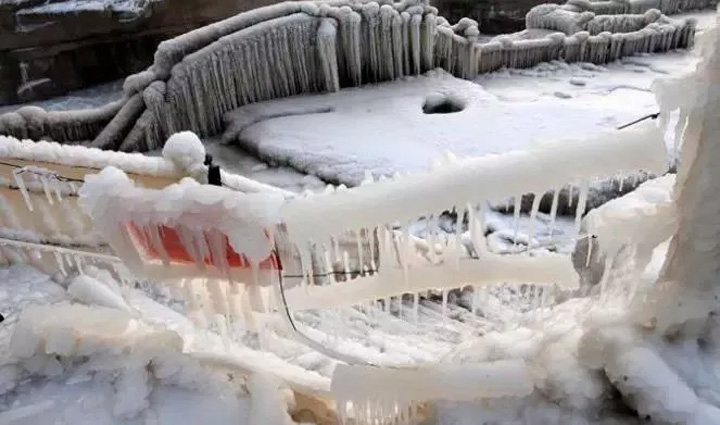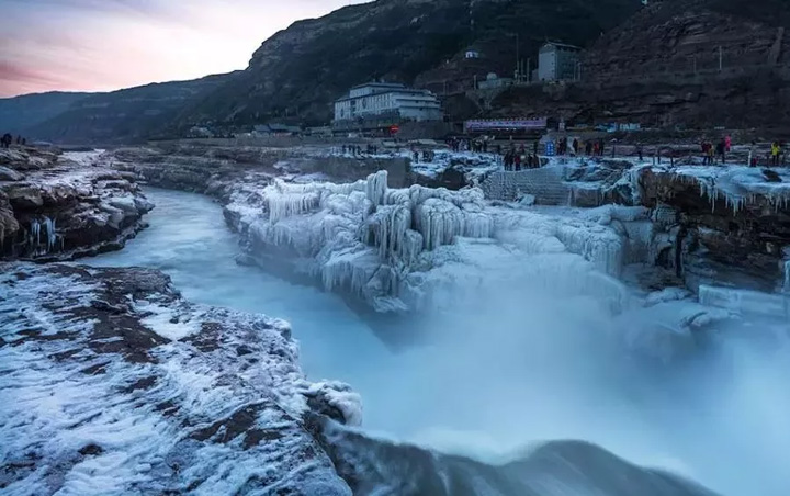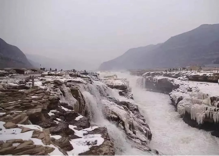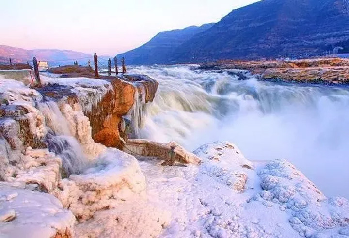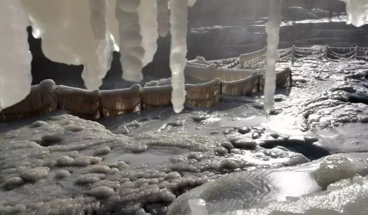 壺口瀑布哈氣成冰,瀑布落差五十公尺,濺起漫天水霧,在寒冷的冬天裡隨風化冰,掛滿懸崖和護欄,形成奇形怪狀的冰雕,引得遊客駐足欣賞。