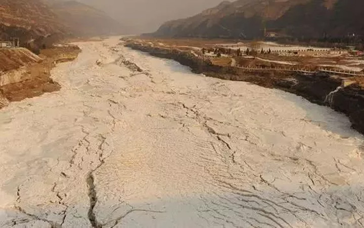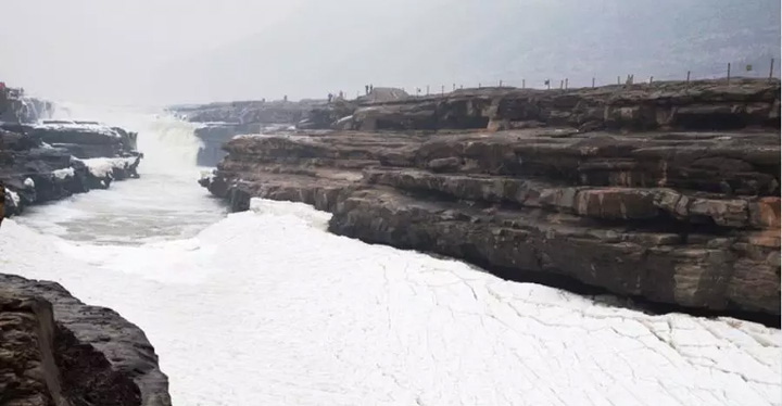 壺口瀑布莊嚴肅穆,除了靠近瀑布的百公尺流段還能看見黃河水流動,其他地方已經被冰封,側瀑布也已冰封,冰峰倒掛,銀裝素裹。