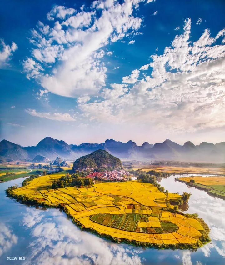 青山環繞,良田連綿,蒼鷺高飛,水天一色,一時一景。