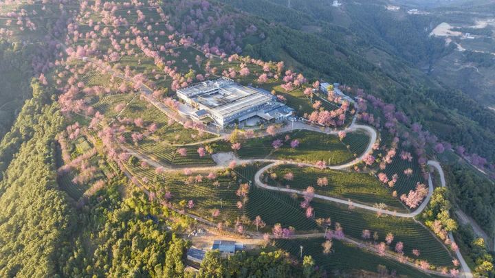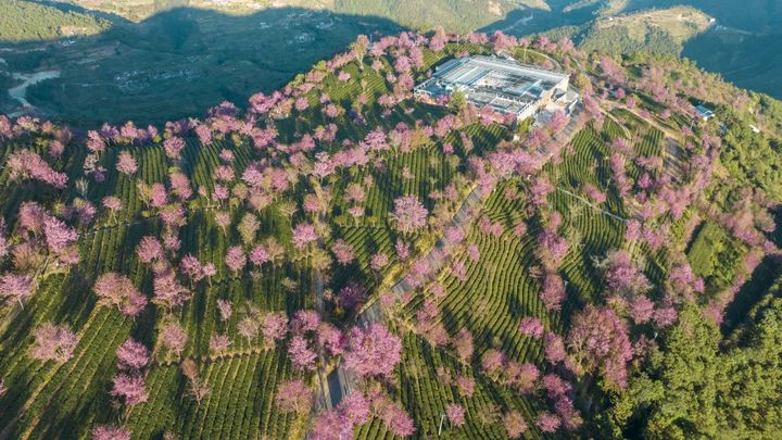 間植在萬畝茶園中的冬櫻花漸次綻放