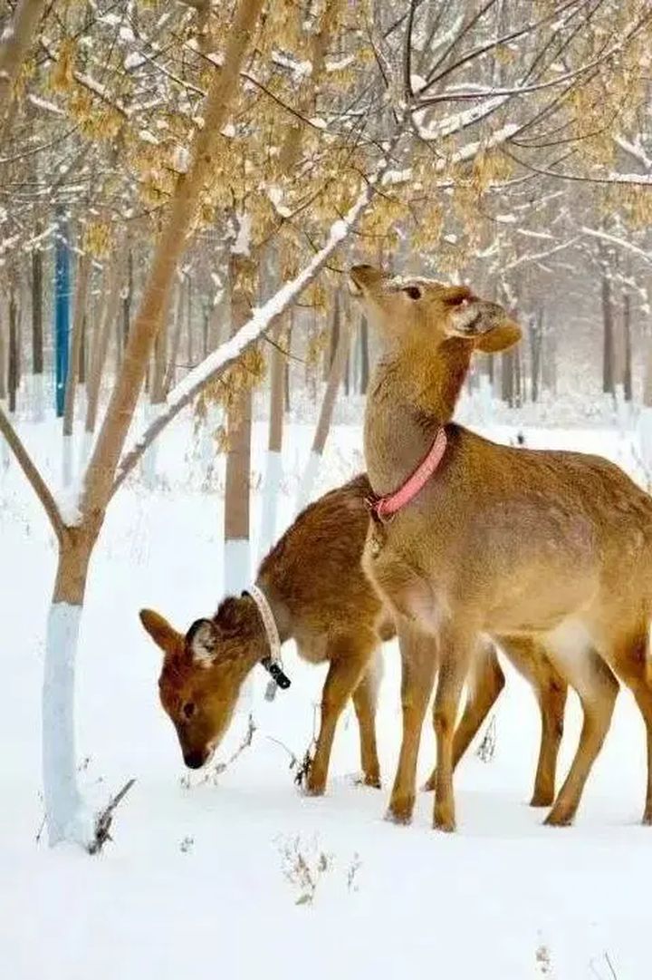 “盛京圍場” “皇家鹿苑”,遼源的盛名可不僅止於此。“農民畫之鄉”“剪紙之鄉”“二人轉之鄉”“棉襪之鄉”“琵琶之鄉”……遼源的發展脈絡早已不受歷史和地域的束縛,有了自己的驕傲模樣。而遼源最負盛名的,還是 “梅花鹿之鄉”吧?繞盈河畔,靈動可愛的梅花鹿時而嬉戲追逐,時而親雪覓食,鹿與雪如此和諧。在養鹿人的看護下,人們可以與梅花鹿親近玩耍,餵食、拍照、合影,是如今難得的體驗。
