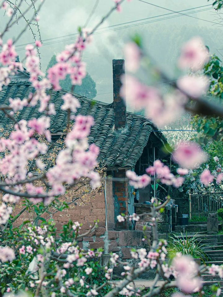炊煙裊裊起,老屋映桃紅