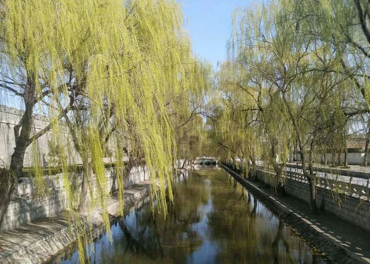 護城河畔的柳樹枝葉婆娑,隨風輕擺