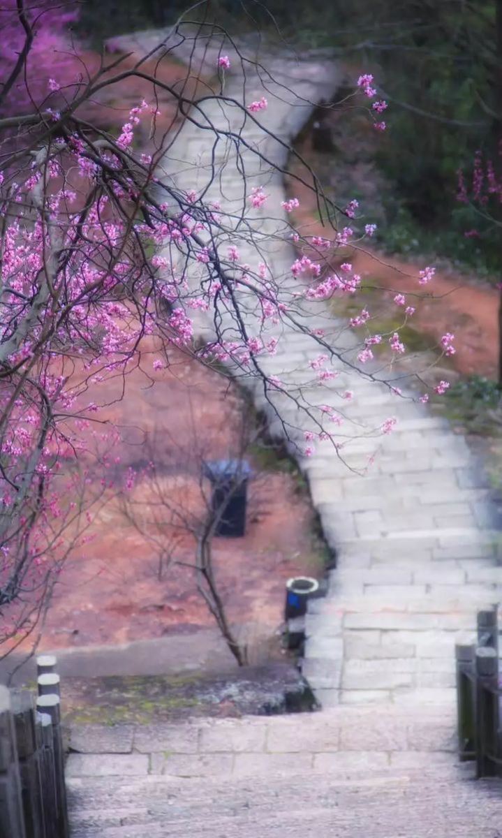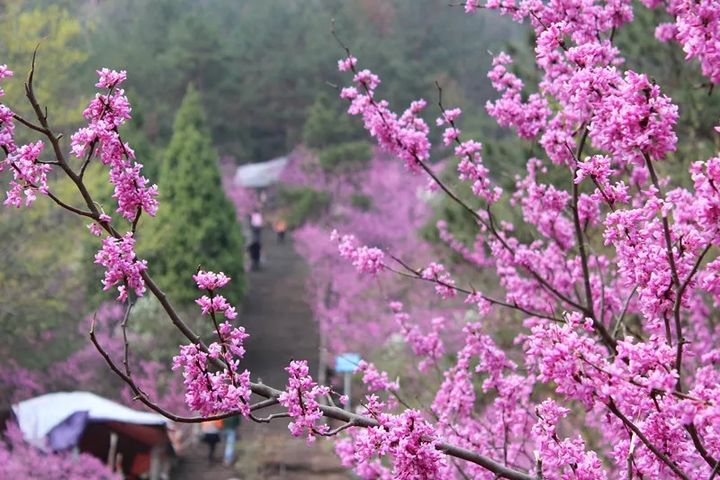 暮春的赤城山,紫荊花佈滿山嶺,淺紫色的紫荊花和山頂聳立的梁妃塔相互襯托,把山谷裝扮得格外妖嬈。 紫荊花學名Cercis chinensis。 花期冬春之間,花開滿枝,略帶芳香,多為紅色或紫色,十分美觀。 赤城山的紫荊花長得又十分巧妙,沿著遊步道的兩旁一路到山頂。