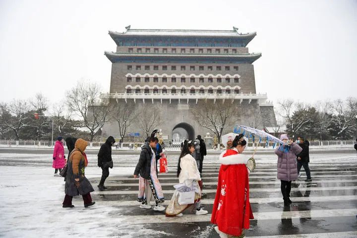 遊客行走在雪後的正陽門箭樓前(2023年12月14日攝)。新華社記者 鞠煥宗 攝