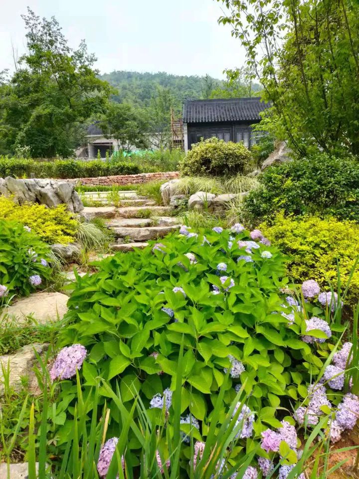 青石板小路間,各色灌木夾道而立,繡球花掩映茂密的綠葉中,民宿錯落有致,頓然便生出一股曲徑通幽之感。