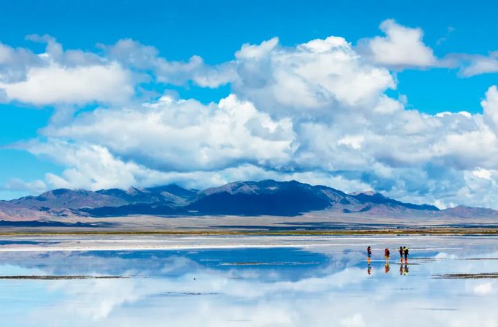 茶卡鹽湖是一片天然的結晶鹽湖,如一面巨大的鏡子倒映著藍天白雲。 湖面透亮,走在其中,宛如被「雙重」仙境包圍。