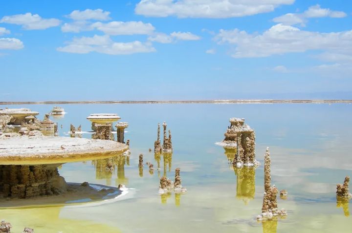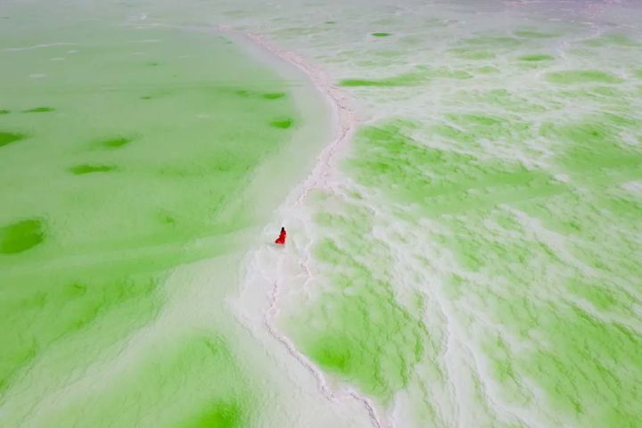 湖中的鹽花,晶瑩剔透,千姿百態,令人驚歎不已。 風平浪靜的時候,波光粼粼,碧綠萬頃。