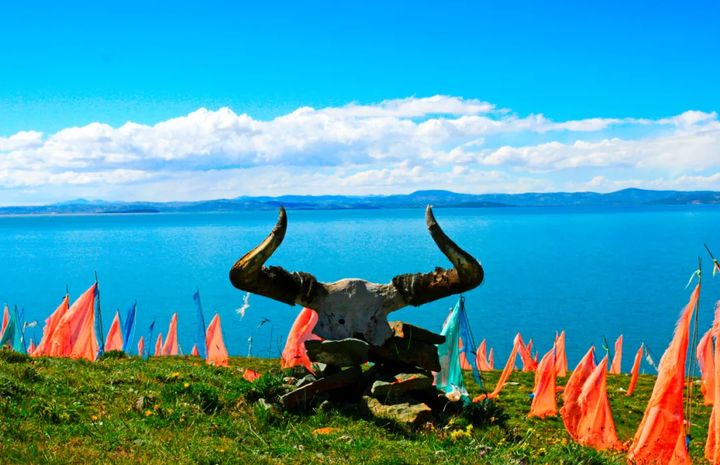 鄂陵湖的景色美不勝收,水面微波清晰可見,清風徐來水波粼粼。岸邊各色野花叢生,湖中鷗鳥靜靜地在離岸較遠的地方游來游去,偶爾會展翅飛翔,還有那靛藍的湖水甚是迷人。