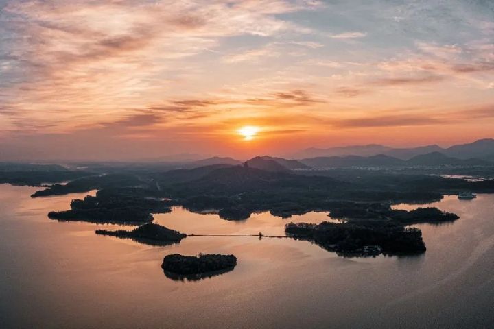 夏天裡的夕陽,不僅有燦爛奪目的一面,也有溫柔治癒的一面,當夕陽的光芒照射在天的另一邊,整座湖面也變得溫柔起來,讓人久久沉醉其中。