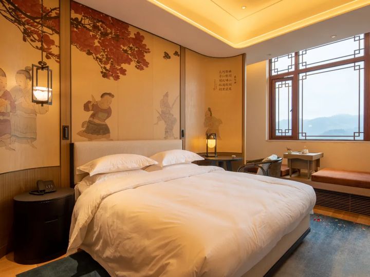 酒店客房寬敞舒適,房間牆面採用絲質材料,床頭背景牆是手繪圖(古時貴州百姓在花前樹下載歌載舞的愜意場景),給住客展現一個文化內涵豐富的多彩貴州。