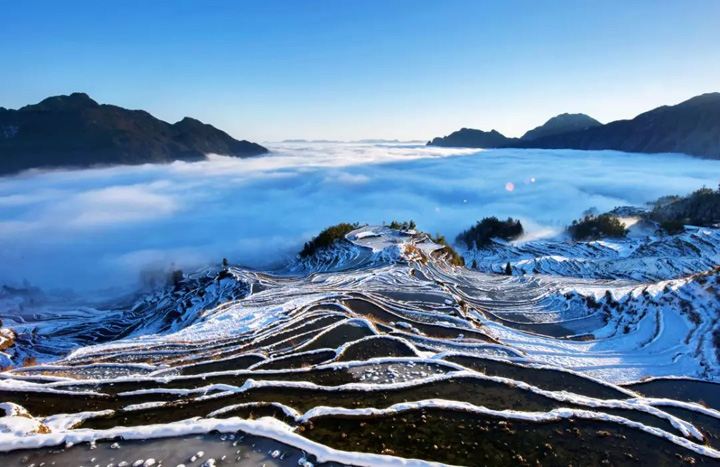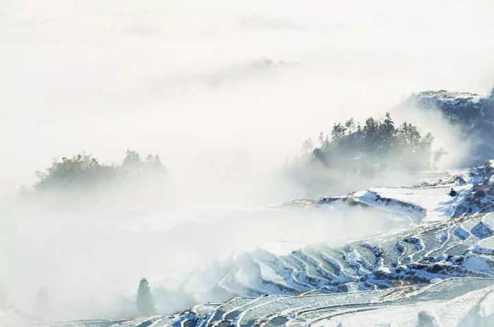人人常常流連於滿山的青翠金黃,孰知冬季看梯田的銀白雪景更有一番妙趣。如果趕上一場紛紛揚揚的大雪,整個雲和梯田即會銀裝素裹,美不勝收,讓人仿佛進入一個冰雕玉琢的人間仙境,盡情感受那冰雪賦予梯田的別樣風情…