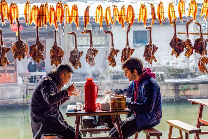 安昌的魅力,在於它積澱深厚的歷史文化。沒有摩肩接踵的遊客,有的只是原汁原味的水鄉風情。隆冬臘月來到這裡,一串串當地居民手工製作的臘腸、臘味掛在河邊,沿著悠悠河水不緊不慢的走進老街,看陽光在石板路上照的鋥鋥發亮。