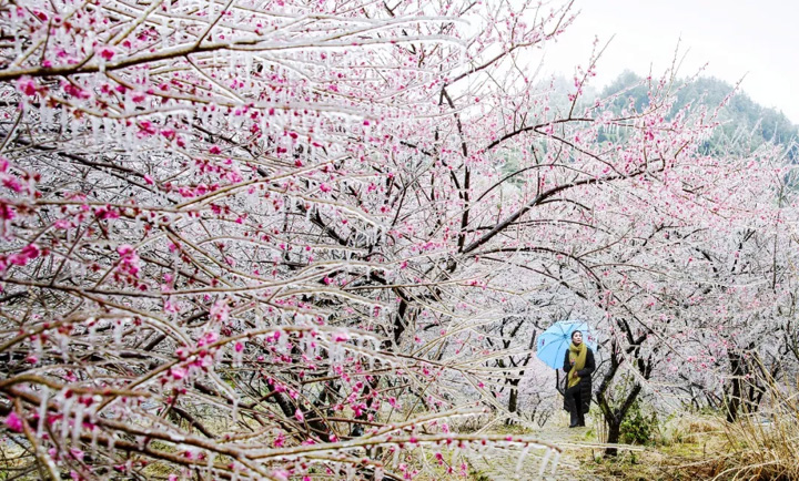 七里大頭村,就像世外桃源般坐落在柯城的深山竹林間,是備受當地人推崇的賞梅勝地。穿梭在這滿園春色間,只見紅梅盛妝,白梅素裹,旁逸斜出的枝條好像纖纖玉指,拈著朵朵嬌嫩小花。一陣風來,花瓣紛紛揚揚,成就了樹下的一地繽紛。