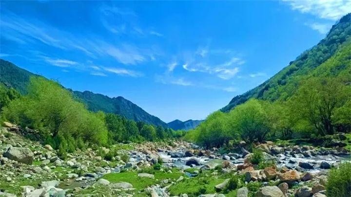 “世外桃源”般的冰溝河,藍天白雲,峰巒迴環,這裡的夏天沒有30°C的高溫,只有20°C的涼爽。 山間偶爾有清風拂過,撥動著髮絲,吹動著衣裳。 馬蘭花大草原一望無際,青青草甸裝扮著夏季的色彩,行走在其中,彷彿像是打開另一個世界,山上山下,綠意瀰漫,清涼舒心。