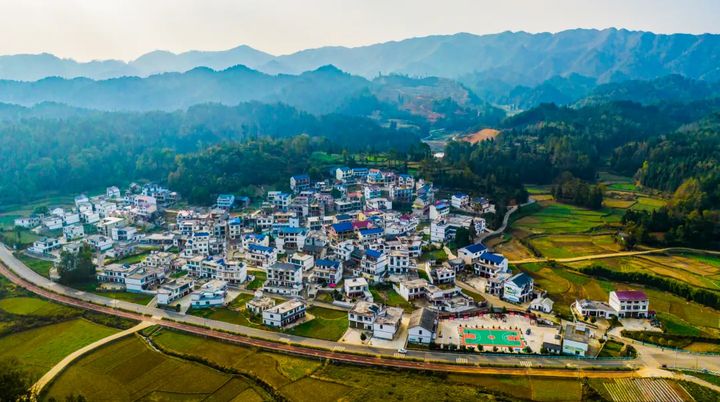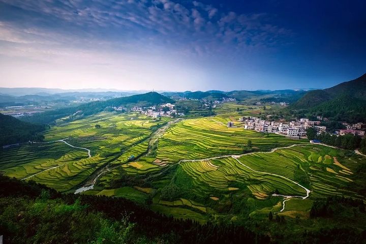 蒼翠欲滴的青山下,民居錯落有致分佈著,四通八達的小路串聯著每家每戶,田園裡的農作物顏色正由青變黃,另一番景色正在展露。
