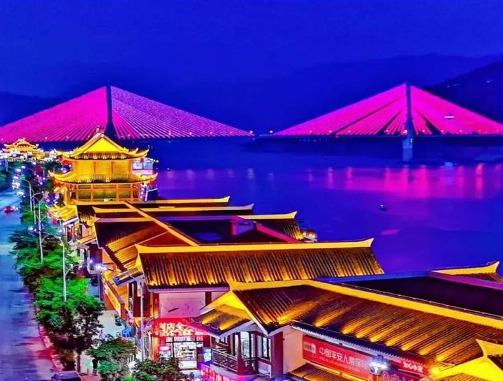 濱河公園——體育館——美術館——圖書館——海成天街——金街美食街——夔門印象美食街——夔門長江大橋夜景