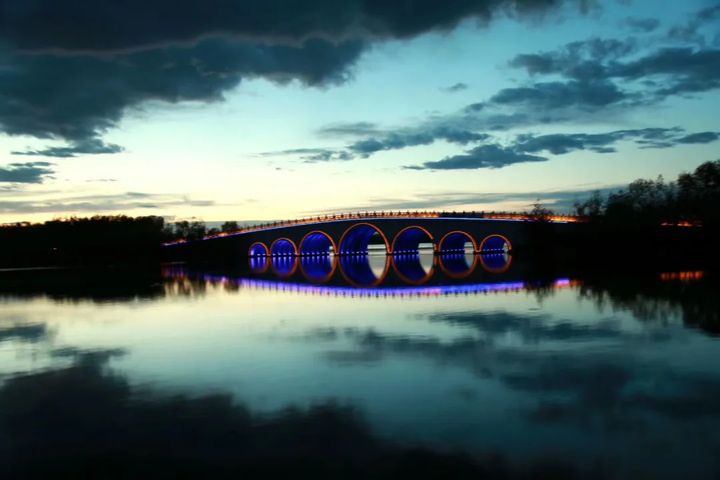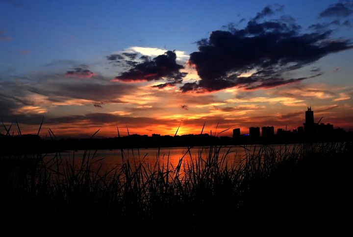 夜間是霓虹燈下映襯的深邃幽藍,大安嫩江灣靜靜的河水被天空襯得沉靜而神秘,藍天、江水,構成一幅水天相接的絕美畫面。