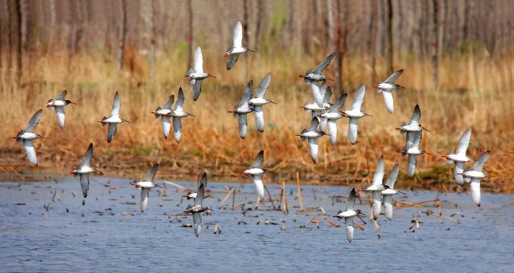 美麗的落日餘暉下,白鷺、天鵝、大雁……