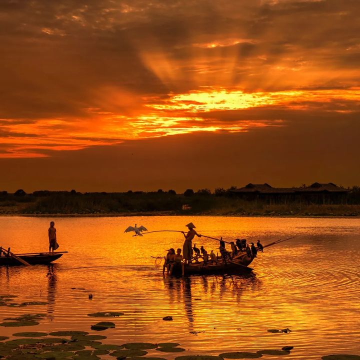 在落日夕陽的映襯下,微山湖變成了一幅天然畫卷。