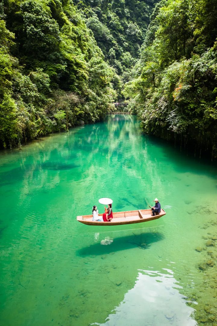 連綿十幾公里的水系處處清澈見底,最深處達20多公尺,船隻停泊在平靜的水面上宛如懸浮在半空中。