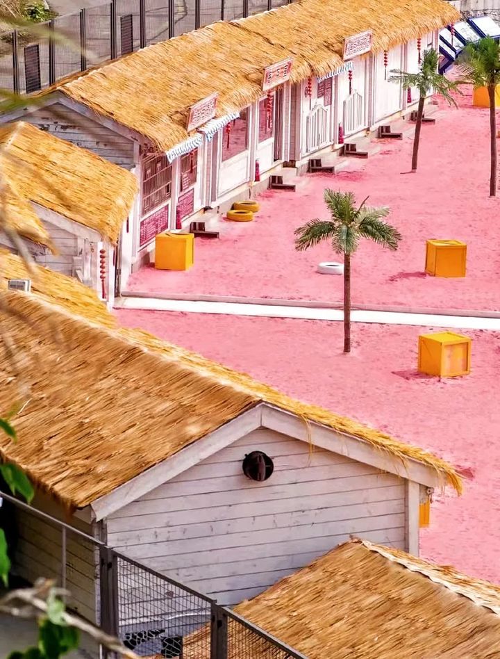 除了大海的清澈湛藍、礁石的五色斑斕,還有一抹粉紅色與金黃的沙灘交相輝映。 長長的粉紅沙灘上,有一片專屬的INS風打卡區。 長廊、粉色遮陽傘、舊車打卡點、白色靠椅,隨便找一處角落,隨手一拍,出片率100%。