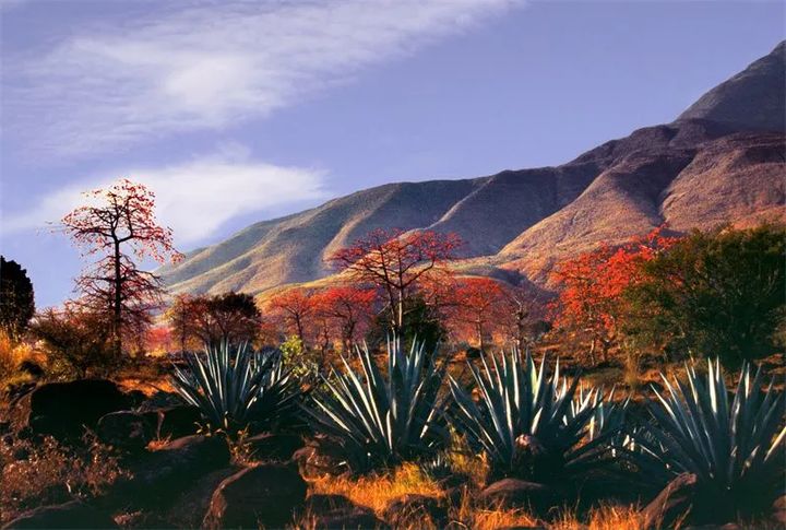 一簇簇劍麻和高大挺拔的攀花樹相伴