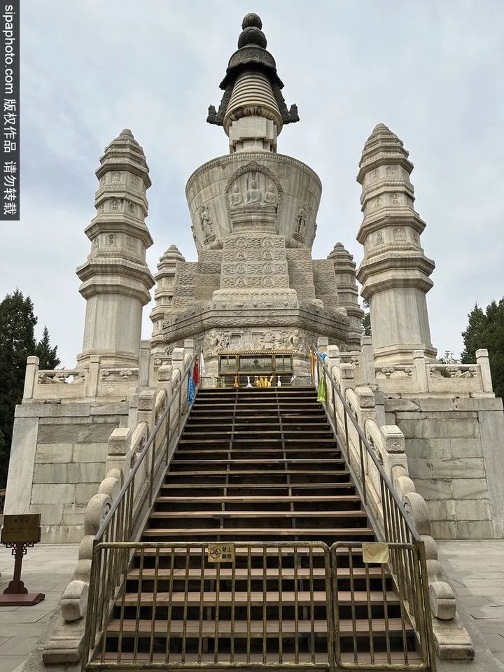 其形製仿照印度菩提伽耶金剛寶座式樣,呈“亞”字形。 三公尺多高的漢白玉金剛寶座之上,建有五座塔,主塔為西藏風格的覆缽式塔,高23.28公尺,居於正中;四周各有一座高9公尺的八角行經幢式塔,向外凸出。