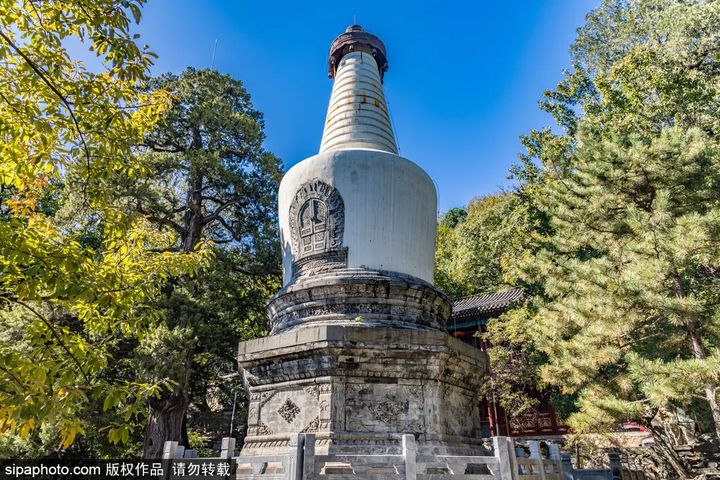 潭柘寺白塔即金剛延壽塔,位於潭柘寺內第四進院的東路,是白色覆缽式磚石塔,建於圓通殿與地藏殿之間。