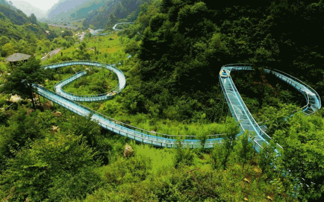 紅溪景區的玻璃滑道是桂林市首條最長的“全透明森林玻璃滑道",位於景區下山路段,採用純玻璃的設計,高端炫目,滑道總長度488公尺,高度落差達100公尺。從遠處看,那在森林裡蜿蜒的玻璃滑道,就像一條匍匐盤山的青龍等待著與你征服天地的快意。