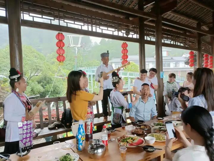結束行程,饑腸轆轆。渴望美食充饑的心愈發強烈。山腳長廊上,擺上長達十數公尺的宴席,水族族民用地道的土家話吟唱迎客歌。此時,再品嘗由山泉水烹製而成的水族美食,可真是別有一番滋味。