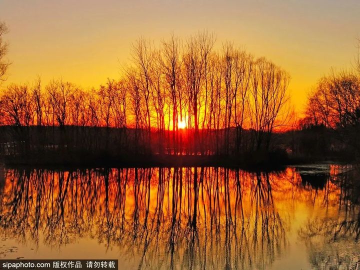 陽透過樹枝,映射在湖面上,美得好似一幅油畫。
