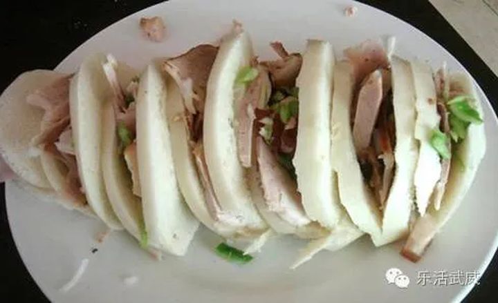 被稱為涼州“三明治”。 用快刀將高莊饅頭切成薄片,將滷肉片、豬肚絲等夾入,形成六夾或八夾,其肉香而不沖、肥而不膩、熟而不爛、肉色金黃、美味飽腹,實屬吃貨最愛。