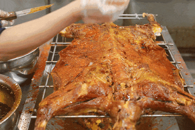 普康戈壁灘羊·烤全羊—精選普康戈壁灘羊20斤左右整體羔羊,經過嚴格的清真屠宰程式,將精選的羊只進行修整,6小時醃製調味,上等果木炭3-4小時精心烤製,色、香、味、形俱全,色澤鮮豔,香氣四溢,皮脆肉嫩,肥而不膩,酥香可口,別具一格。 戈壁灘羊烤全羊是餐桌上不可缺少的一道經典美食。