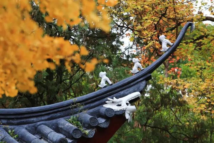 作為上海五大古典園林之一,古猗園早已盛名在外,這裡的小橋流水、亭臺樓閣,顯現著獨屬於江南的臘月美景,雖是花謝葉落,卻不覺淒涼,園中紅楓依舊,與飛簷翹角一同,勾勒出古樸的意境。