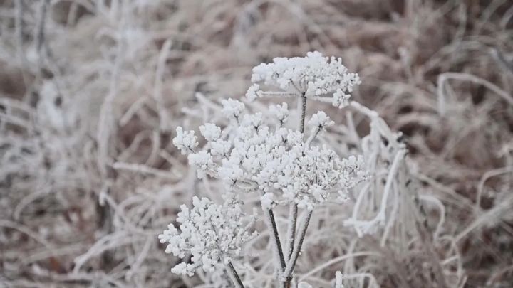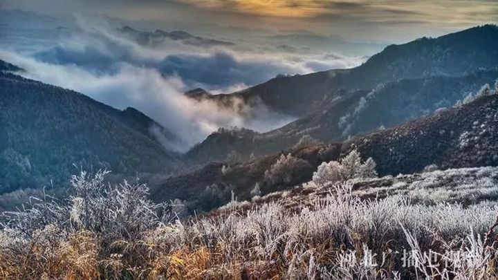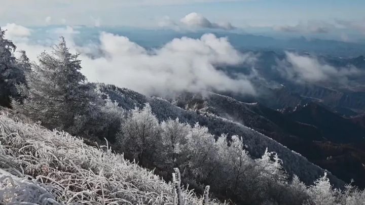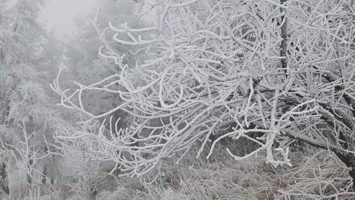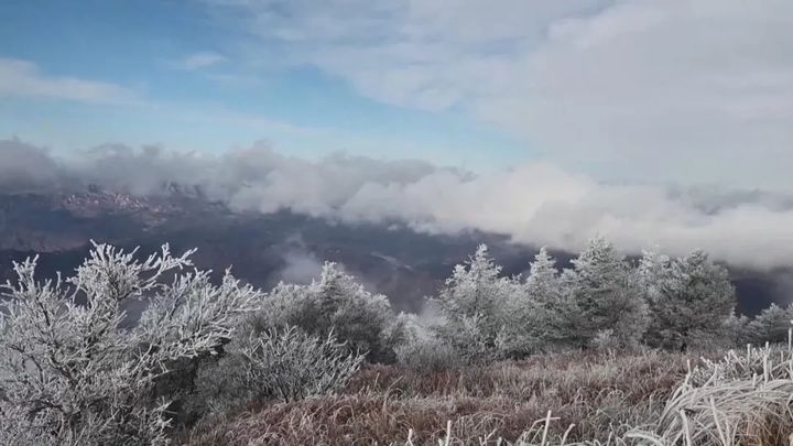 駝梁峰頂出現了霧凇景觀,樹枝草幹上凝凍的白色冰晶沉積物把駝梁峰頂打扮得銀光閃爍,美麗動人,把人們帶進如詩如畫的仙境。