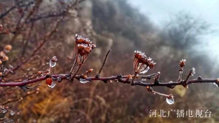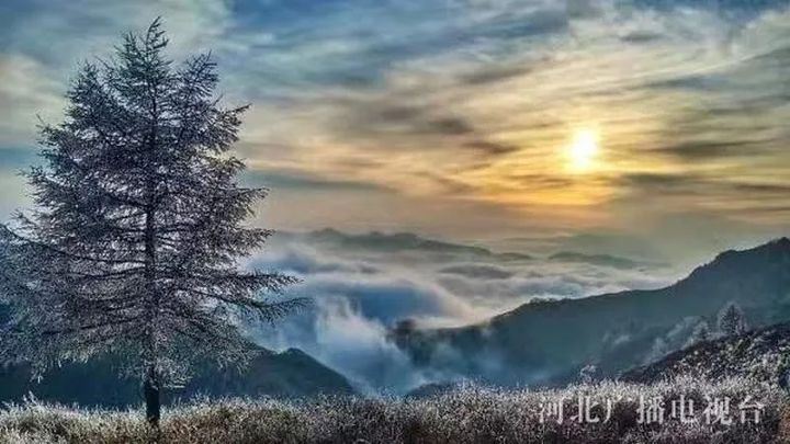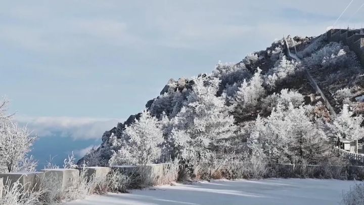承德興隆縣霧靈山境內出現雪凇景觀。 放眼望去,遠處青山象披著一件銀白色的外套,分外妖嬈。