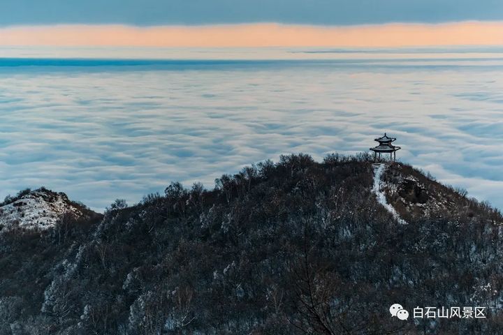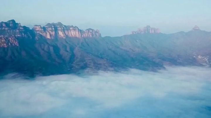 石家莊市平山縣駝梁自然保護區滾滾雲海,雲騰霧繞,山峰在雲海中穿梭,雲海在山澗中翻滾,好似大自然潑灑的水墨畫。