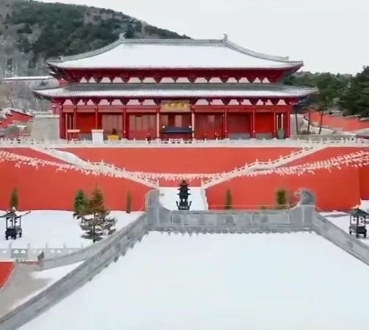 雪染白了每一寸土地,連牆壁與屋頂也披上了白衣,站在這裡,白雪鑲紅牆,有種置身事外的清淨。