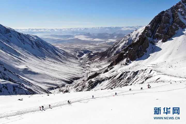 登山愛好者攀登崗什卡雪峰(無人機照片)。 新華社記者 張龍攝