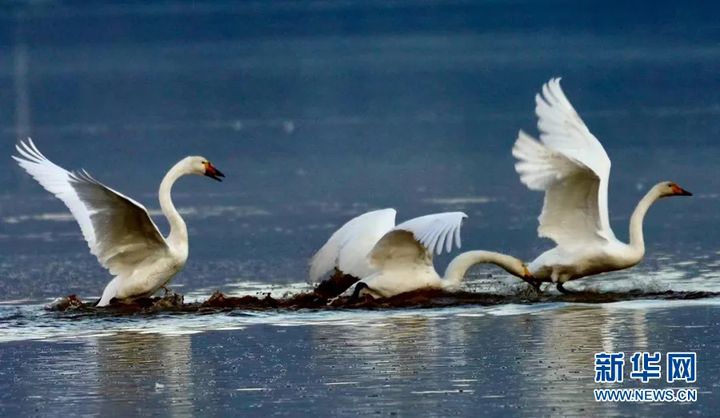 三隻大天鵝在水面嬉戲。 新華網發(李玉峰 攝)