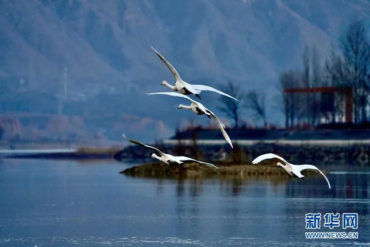 四隻大天鵝飛過水面。 新華網發(李玉峰 攝)