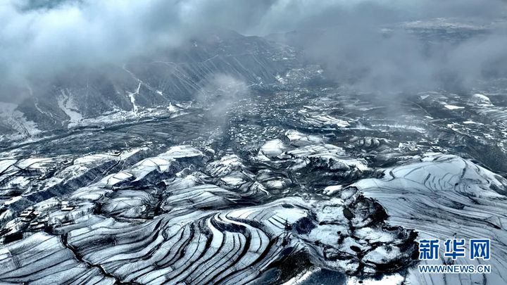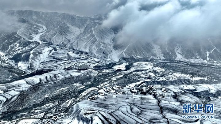 航拍青海省海東市化隆回族自治縣雄先藏族鄉雪景。 新華網發(李玉峰 攝)